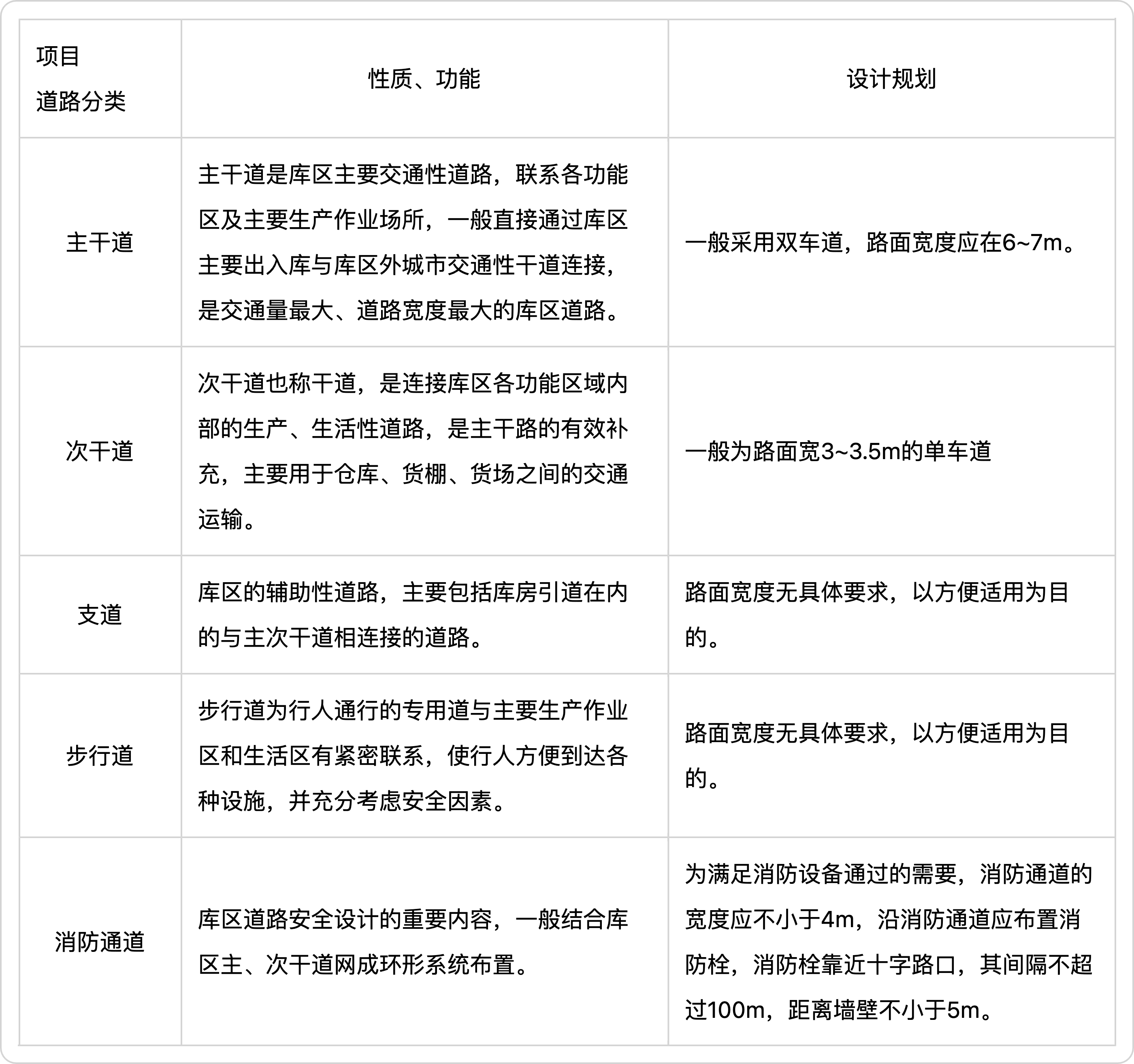 库内道路的配置与仓库主要建筑设施的布置是相互影响、相互联系的。在进行库房、货场和其他作业场地布置的同时就应该结合对库内运输路线的分析,制定不同的方案,通过调整道路和作业场地的配置,尽可能减少运输作业的交叉、混杂和迂回。另外,在布置时还应根据具体要求合理确定支、干线的配置,适当确定道路的宽度,以最大限度地减少道路的占地面积,使仓库储存面积相应扩大。库区道路按其功能不同,可以分为主干道、次干道、支道、步行道、消防通道等,各通道的性质、功能及其设计规划如表2.2.1所示。