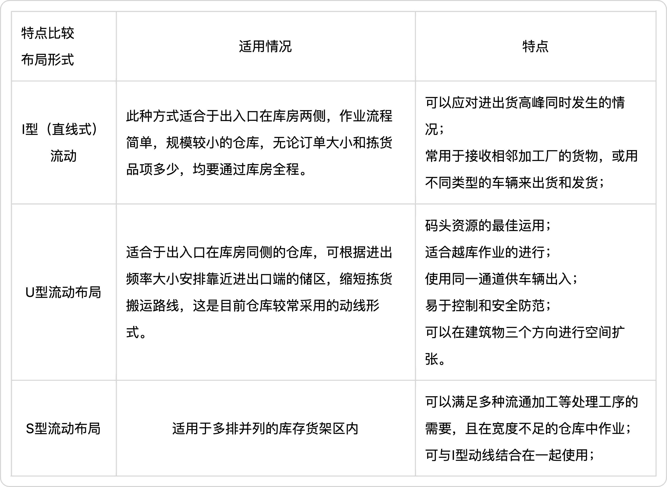 通常货物在仓库中的流动有三种方式:I型(直线型)流动布局、U型流动布局、S型流动布局,其特点如表2.2.2所示,具体布局形式如下图2.2.1、2.2.2、2.2.3所示。
