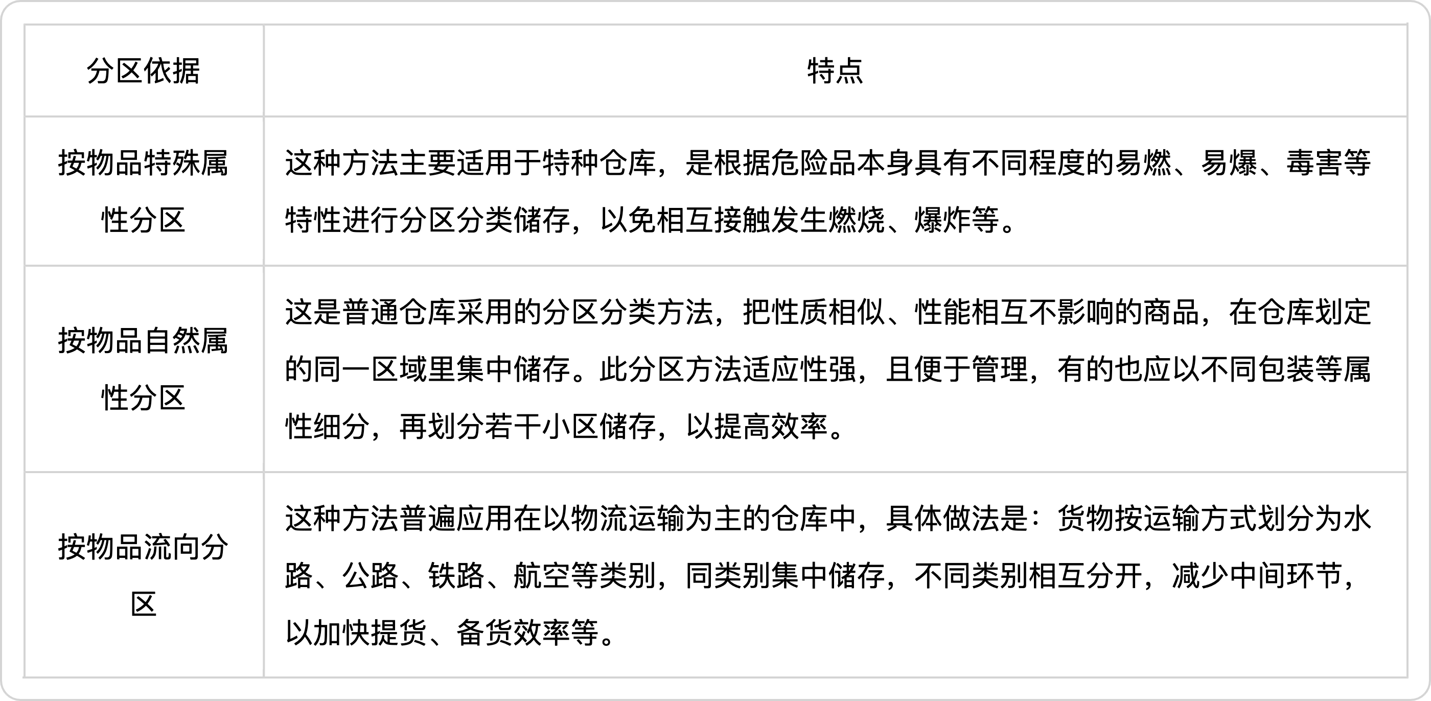 此外,除了基于物品质量状态进行分区外,库房内部储位还可按照物品特殊属性、物品自然属性或物品流向进行分区,具体见下表2.2.4。